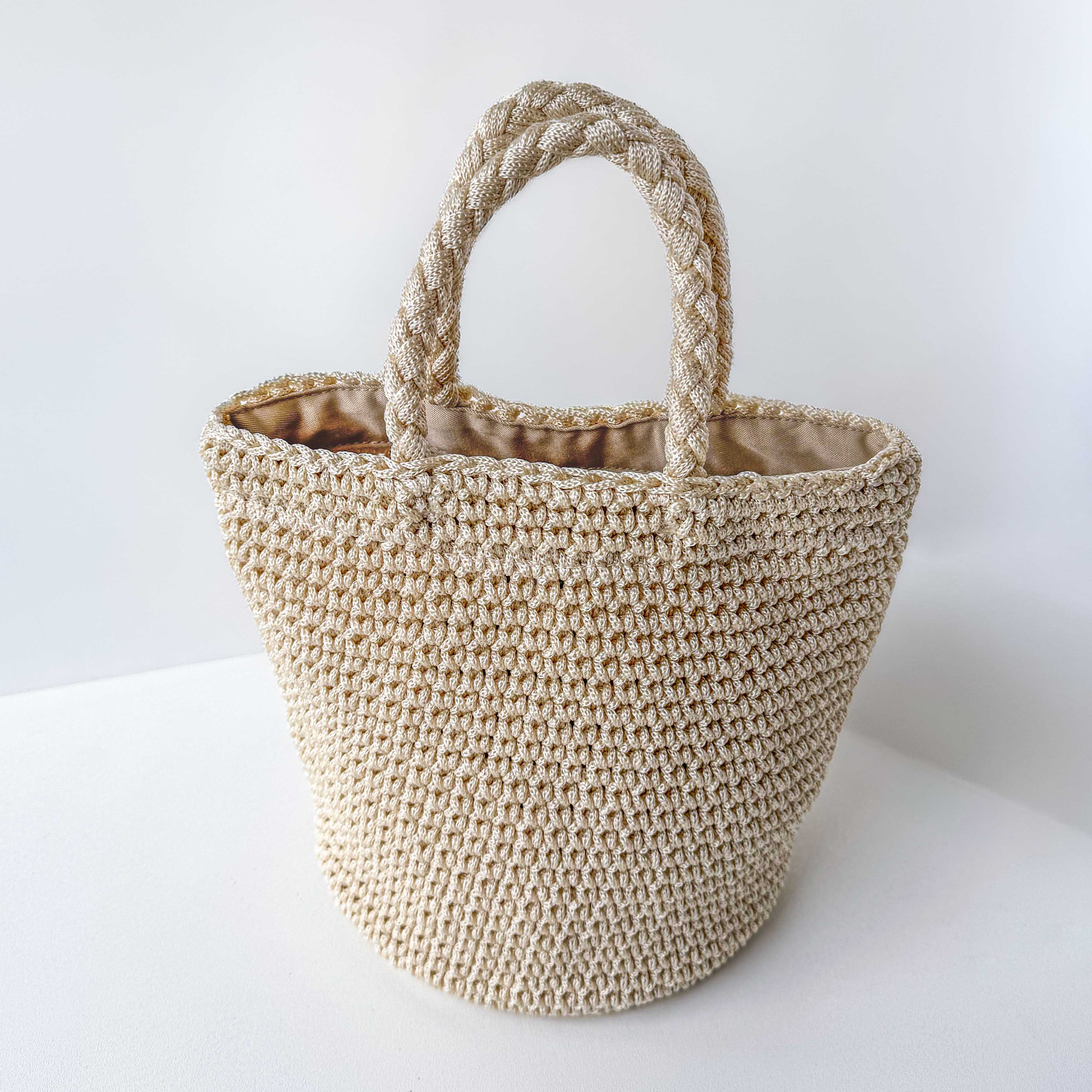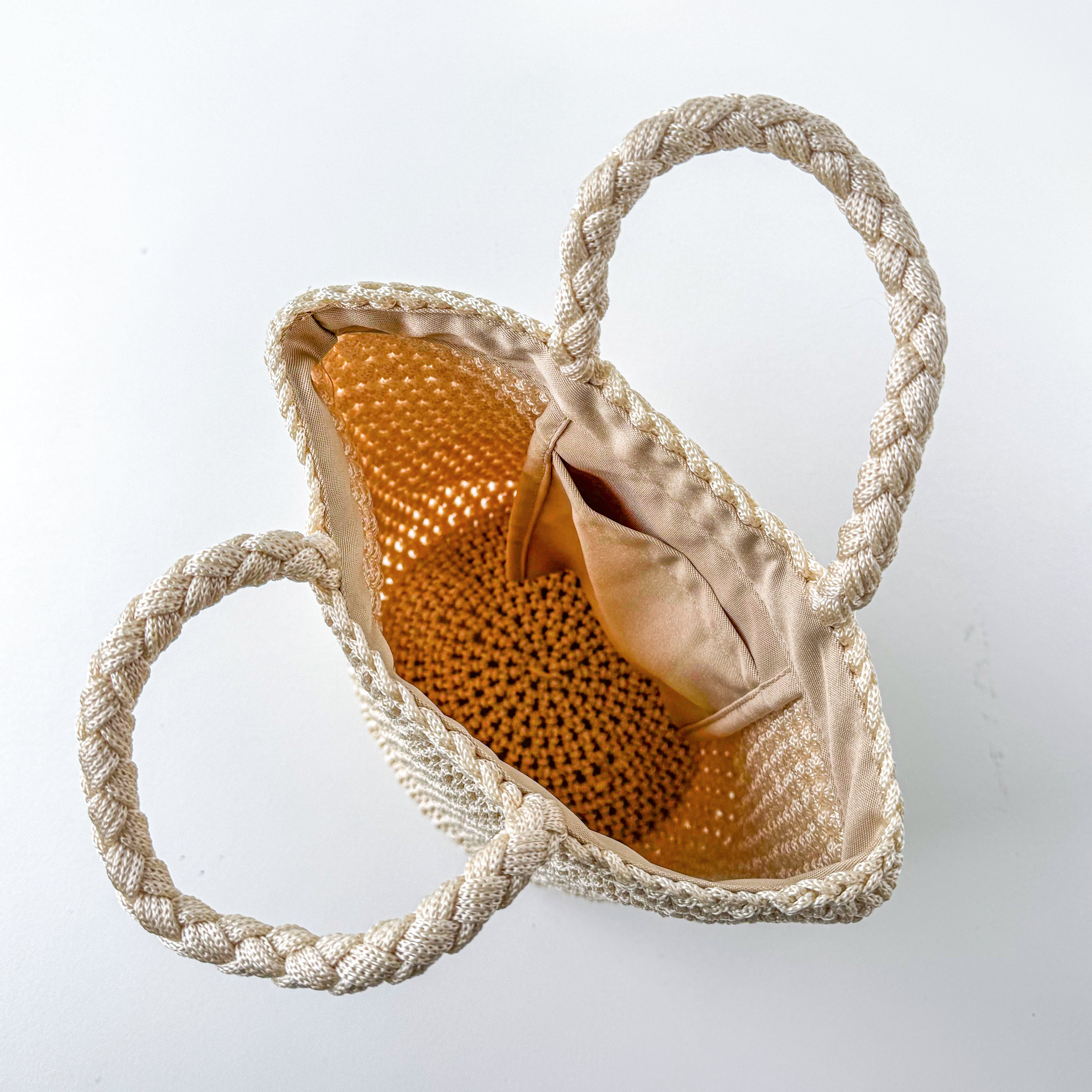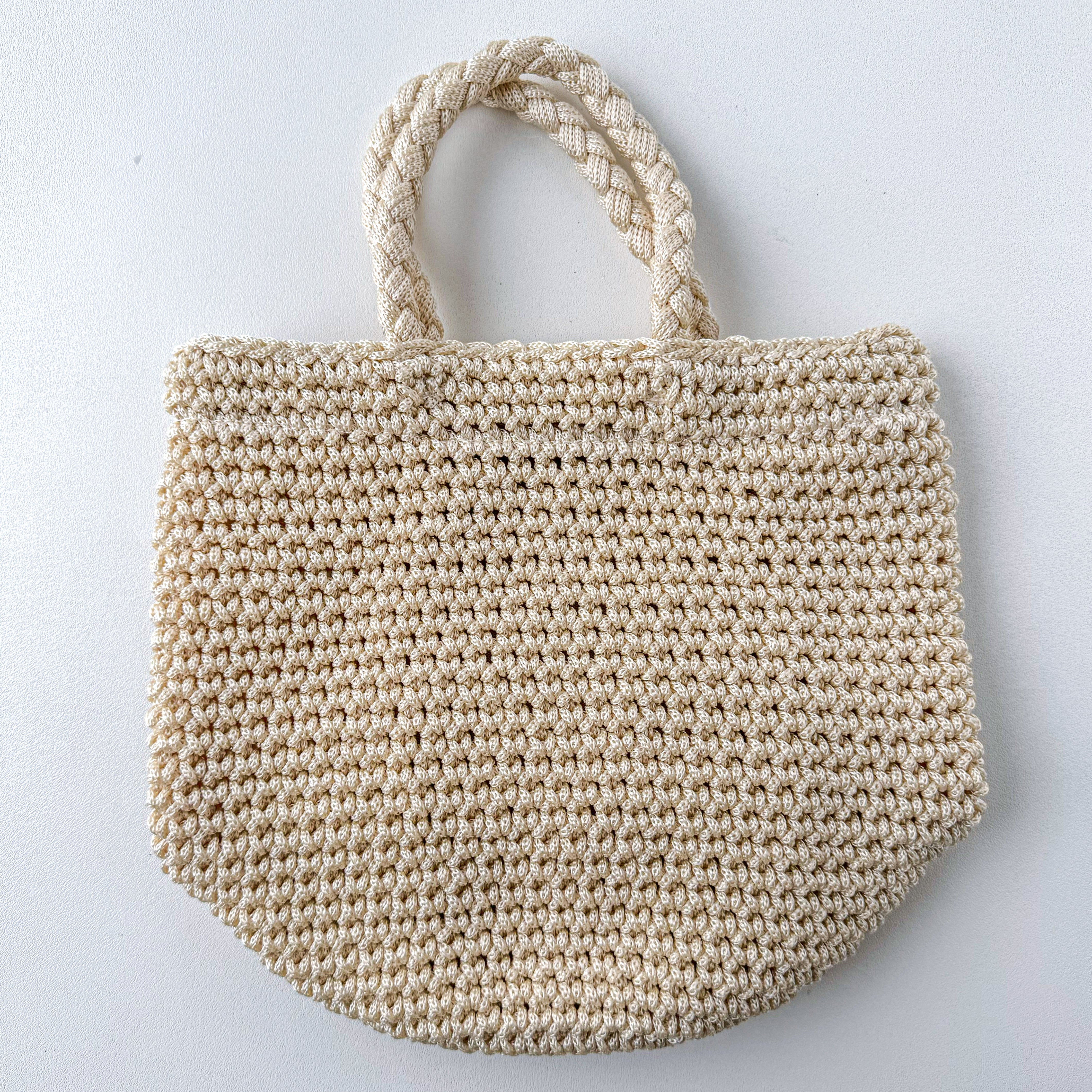 クロシェ風の編み目が特徴の、シンプルなラウンドバッグです。